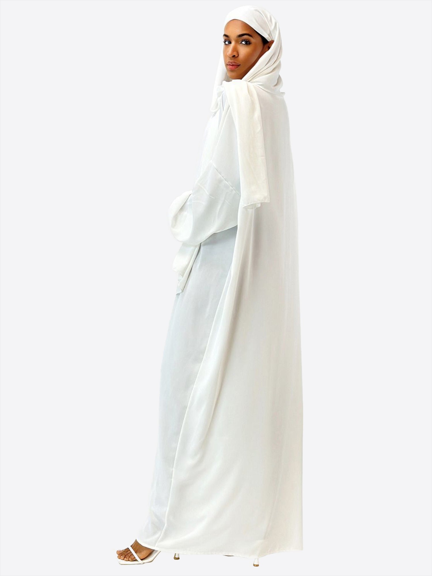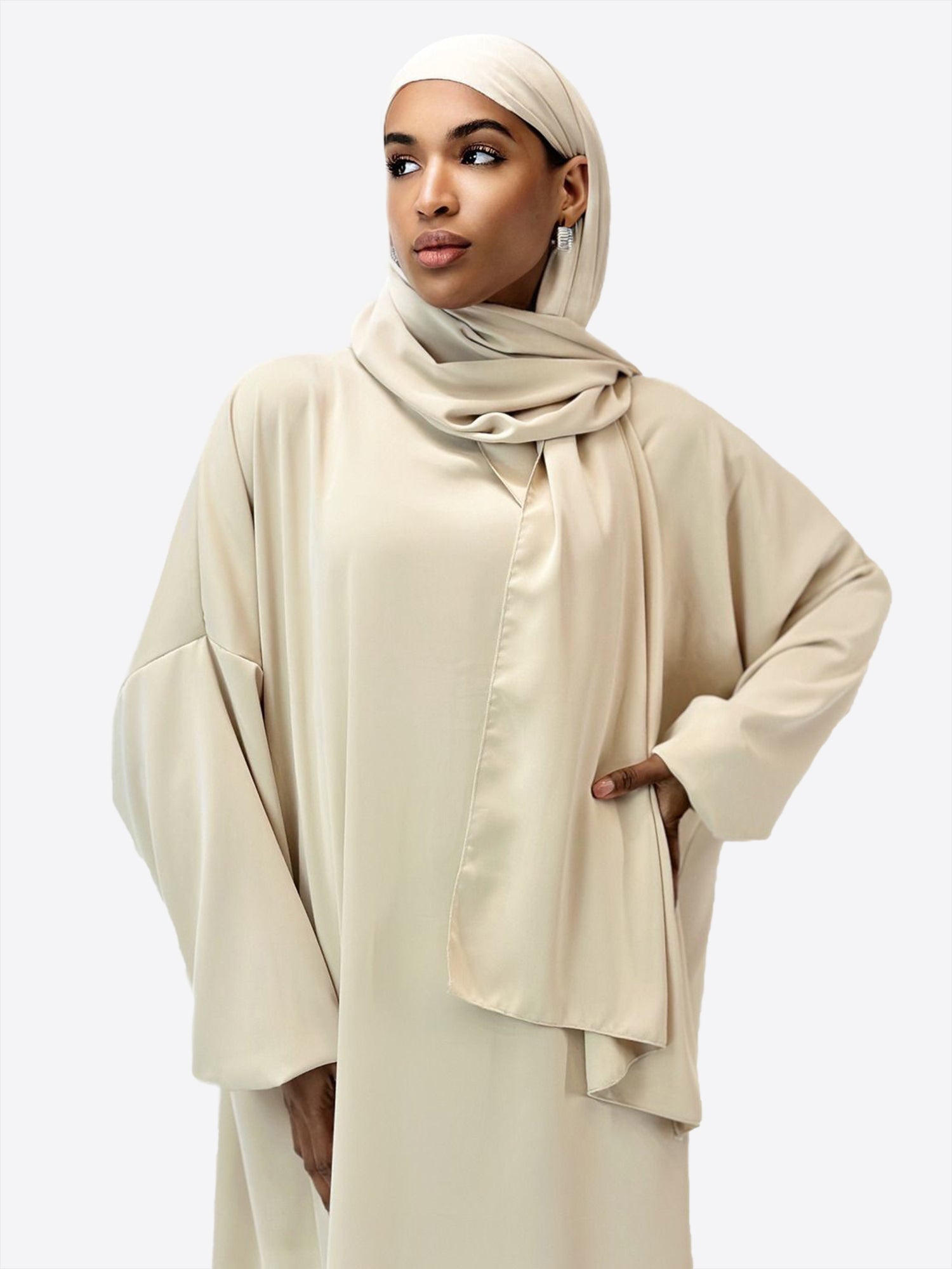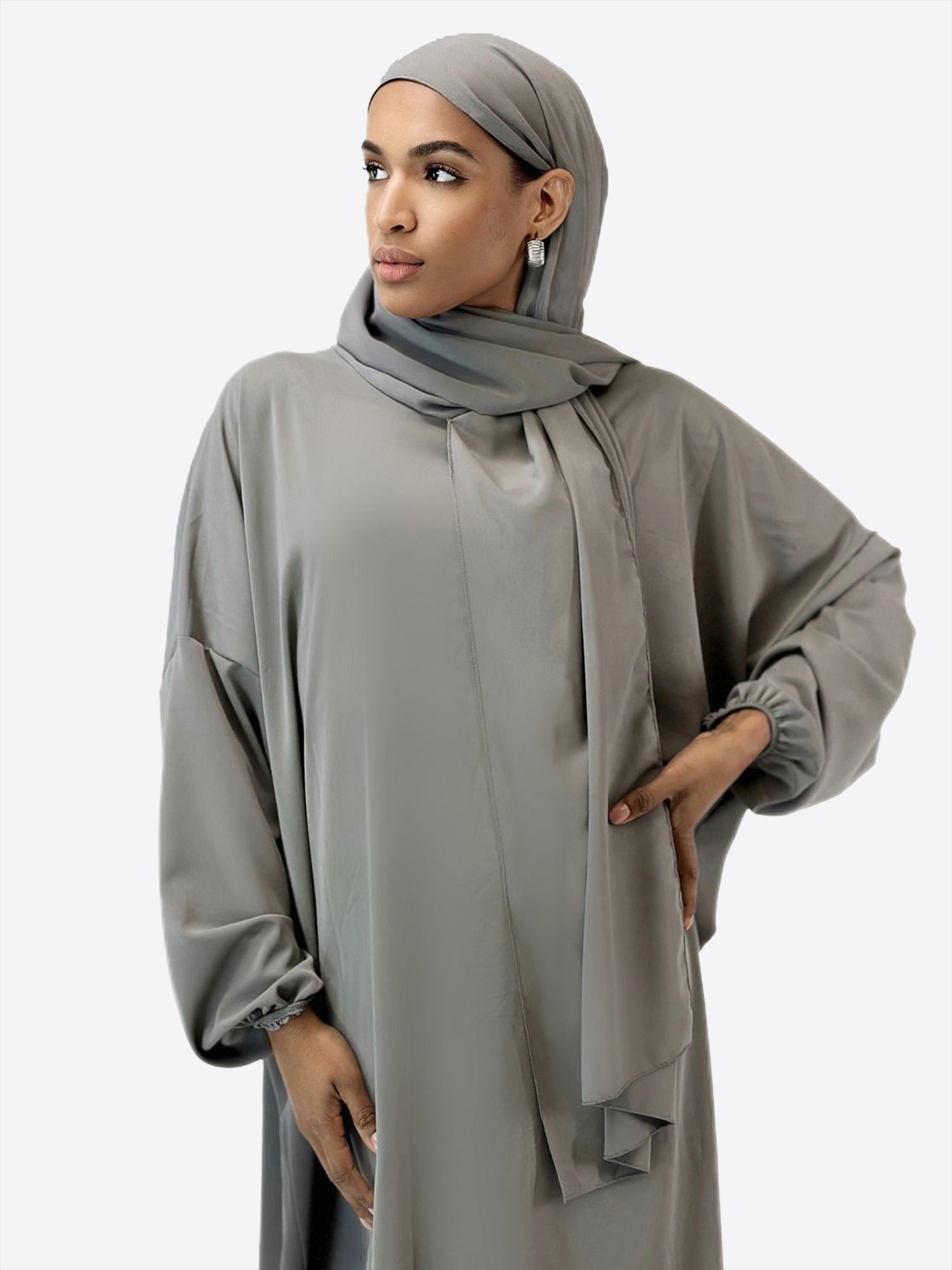 Das wahre Highlight dieser Abaya ist das atemberaubende Kopftuch, kunstvoll verziert mit goldenen Akzenten an den Nähten. Diese subtilen Details verleihen Ihrem Look einen Hauch von Luxus und betonen Ihre Eleganz auf raffinierte Weise. Das Kopftuch komplettiert nicht nur das harmonische Design, sondern ist auch ein Statement für modische Raffinesse.